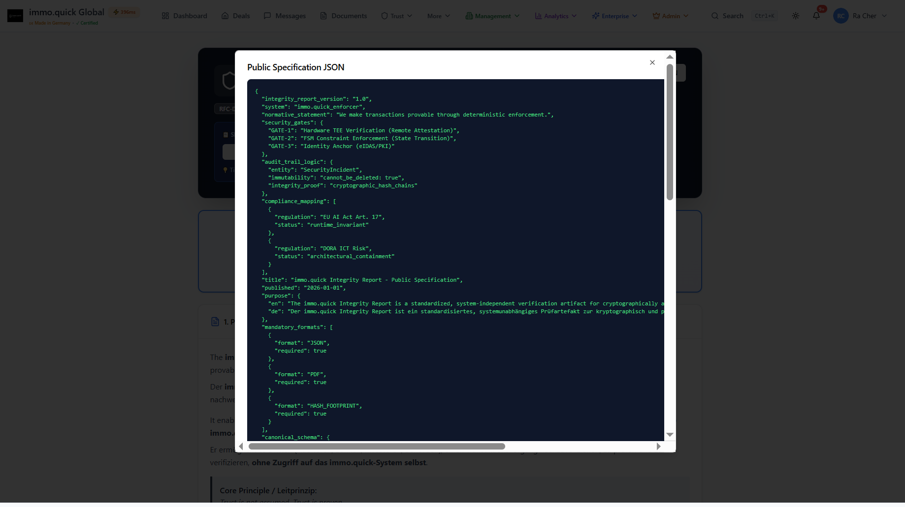 immo.quick Core is the deterministic state machine that bridges the gap between legal text and silicon. It translates regulatory prose (AI Act, DORA) into binary constraints that cannot be bypassed by human error.