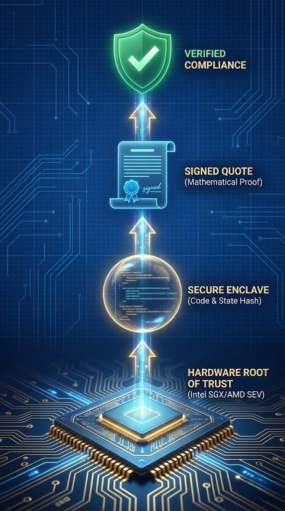 Cryptographic attestation works differently. The hardware itself—the processor with its TEE—generates a signed report (a so-called "Quote") that mathematically proves: