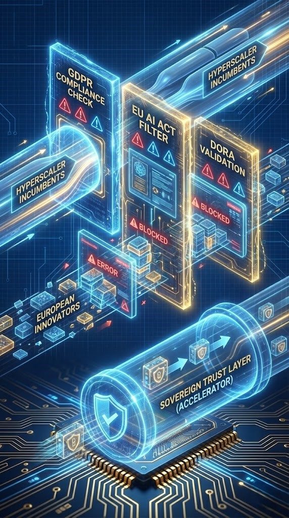 A European startup wanting to develop a sovereign alternative must overcome these hurdles with a fraction of the resources. The result is a regulatory moat: Established providers are protected by the complexity that deters newcomers .