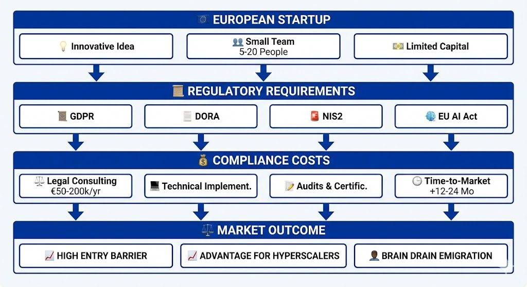 The Paradox of Regulation: Protection as Barrier Europe's regulatory framework—GDPR, DORA, NIS2, EU AI Act—was created to protect citizens and businesses. But for European startups and innovators, this protection has a paradoxical effect: It becomes a market entry barrier .